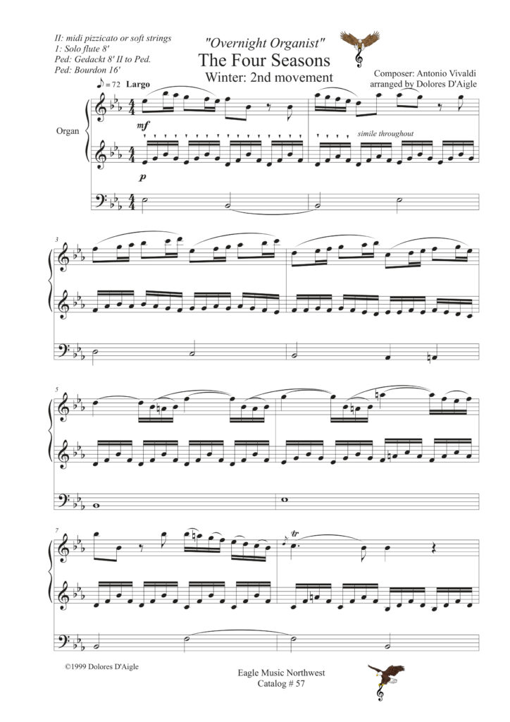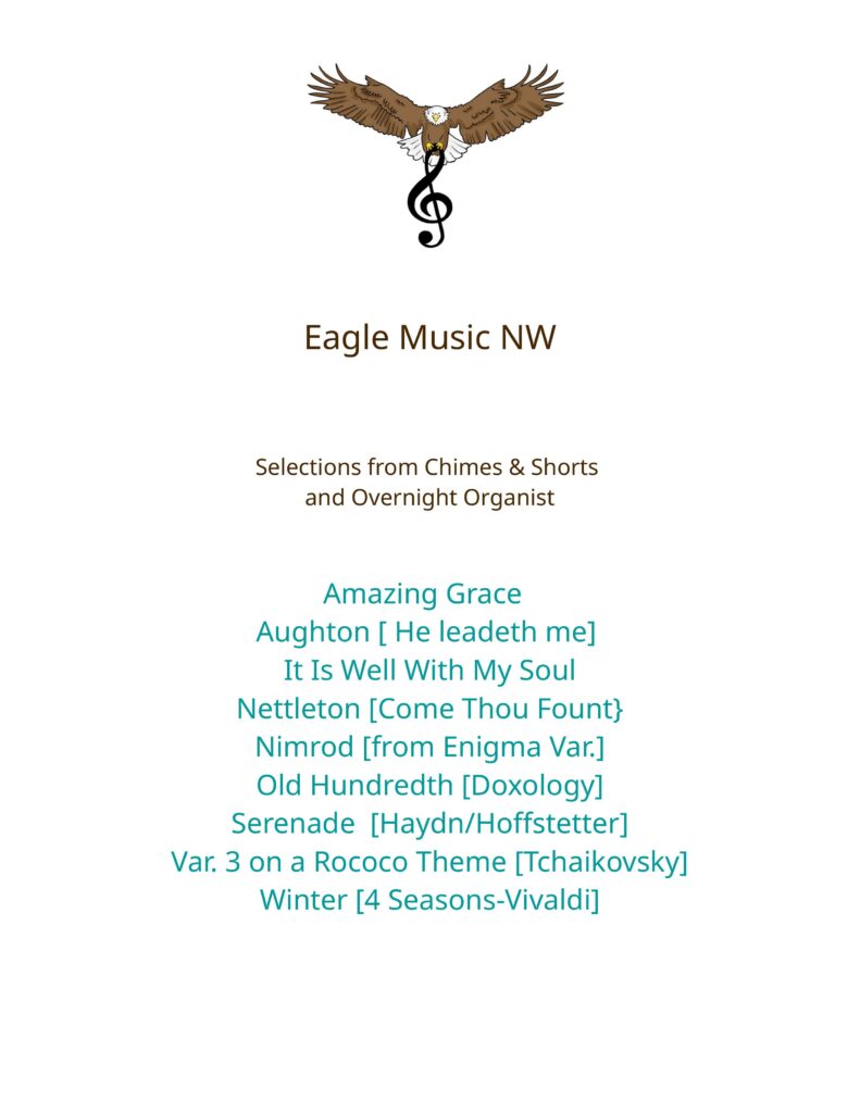 I began by making the harmony and pedal lines of common hymns easier. Then I wrote short chimes and interlude pieces to fill out time. I started arranging favorite chamber and orchestra pieces to increase my repertoire and then redoing existing organ and piano pieces to make them more interesting . I discovered I enjoyed this kind of work, and thinking others might like the pieces, began putting together collections: The Overnight Organist, Quick Keyboard, Chimes and Interludes. Printed versions of these will be available on Arrangeme.com. Various audio clips are on my Facebook page: Eagle Music Northwest.
